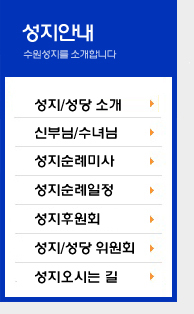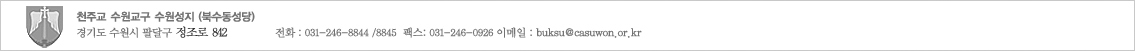 2000년 대희년에 수원교구장 최덕기바오로 주교님께서 수원 화성의 중심인 북수동성당(구 수원성당)을 수원화성에서 주님을 위해 목숨을 바친 81위의 순교자들과 수많은 무명순교자들을 현양하는 성지로 선포하셨습니다. 정조대왕의 명을 받아 다산 정약용(요한)선생께서 설계,시공하신 수원화성은 둘레가 5.743km 직경은 대략 1.8km의 성곽으로 둘러 쌓여있는 아름다운 성이며 1997년에는 유네스코 세계문화 유산으로 지정되었습니다. 현재까지 수원화성의 박해지는 중영, 이아, 화성행궁, 동남각루, 남암문, 팔달문(남문)밖 장터, 장안문(북문)밖 장터, 그 외에도 사형터(화령전과 화서문사이),화서문, 용주사 옛포교당, 매향다리서남쪽, 행궁앞간이형옥, 동북암문, 그리고 형옥,, 19군데로 알려지고 있습니다. 방화수류정은 지붕을 십자가형으로 만들고 팔각정의 기본틀을 변형시켜 서쪽의 벽을 만들어서 서벽안에 86개의 십자가 문양을 새겨 넣은 정자인데, 이는 당시 천주학을 서학이라고 한데서 비록된 것으로 보는 견해가 있으며, 저녁 석양이 질무렵에는 세상 어둠을 쫒는 광명의 상징으로 서벽에 새겨진 십자가들이 빛이 나도록 설계되어 놀라움을 자아냅니다. |